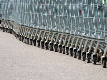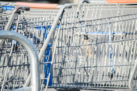 Row of empty shopping carts. Parking at the supermarket. Shopping symbol. Metal carts.