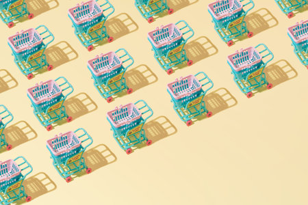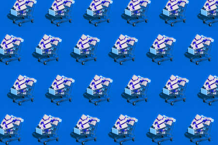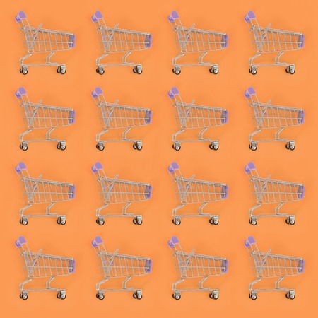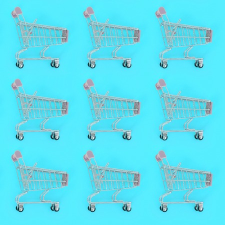 Shopping addiction, shopping lover or shopaholic concept. Many small empty shopping carts perform a pattern on a pastel colored paper background. Flat lay composition, top view.