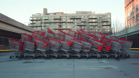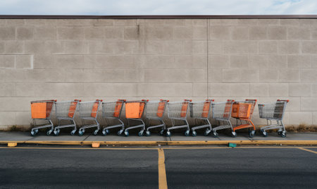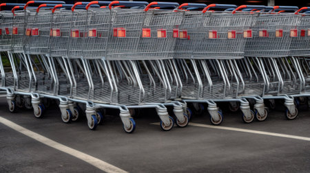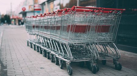 Rows of shiny metal shopping carts lined up on a city sidewalk near a retail store, showcasing everyday urban life and consumer culture in action