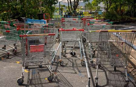 Mackay, Queensland, Australia - January 2021: Old shopping trolleys lined up outside the local tip shop