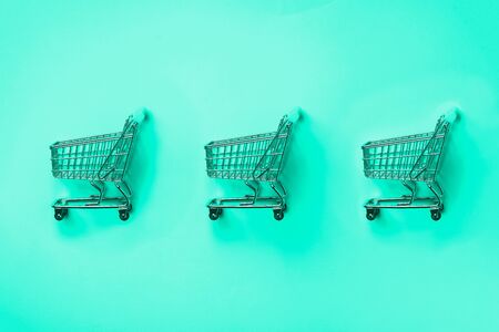 Shopping cart on mint color background. Minimalism style. Creative design. Shop trolley at supermarket. Trendy green and turquoise color. Sale, discount, shopaholism concept