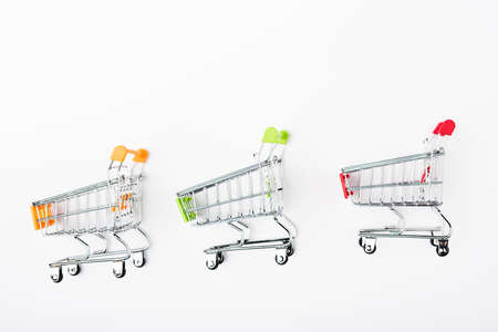 Top view of small shopping carts on white background