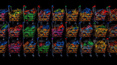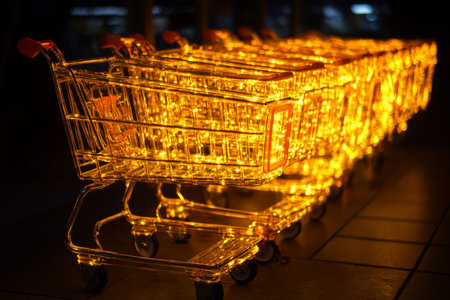 Illuminated shopping cart icons on a dark backdrop creating a striking visual contrast