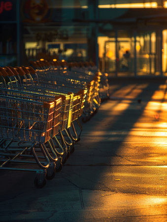 A row of shopping carts stands in a golden aisle of light, creating a mesmerizing and almost ethereal atmosphere