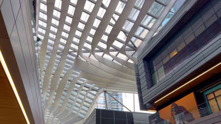 COPENHAGEN, DENMARK - APRIL 30, 2020: Bottom view of glass facade and roof of Black Diamond Royal Library, Copenhagen, Denmark