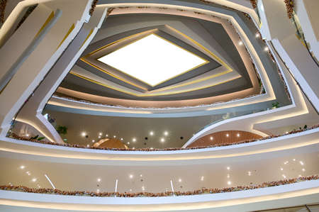 Interior of a modern multi-storey shopping center. Top to bottom view.