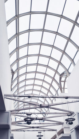the metal and glass roof of a mall