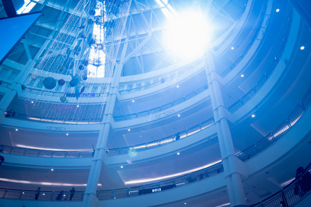 Sun rays light effects on buildings interiors. Sun shining though glass roof in shoping center. Abstract architecture fragment.