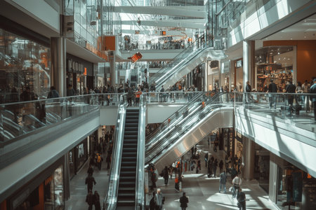 Vibrant shopping mall with escalators linking diverse stores and thriving customers exploring brands