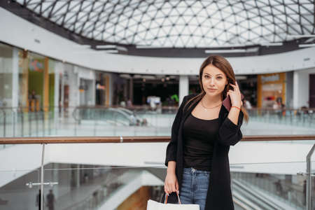 Little fashion girl with packages in a large shopping center. Pretty smiling little girl with shopping bags posing in the shop