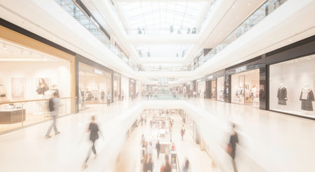 Luminous Mall Interior with Hazy Shoppers, Stunning Architecture, and Ethereal Light Effects