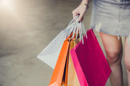 Close up of asian woman shopaholic hand with many colorful shopping bags after just end up shopping and payment by cash in shopping mall