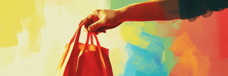 A hand reaches out with a grocery bag, inviting the viewer to share in a moment of community and connection, highlighted by soft, bright colors.