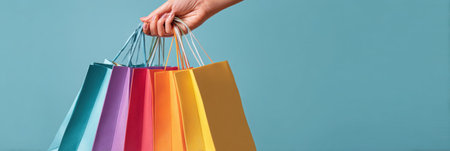 Hand grasps a vibrant collection of shopping bags in various colors, showing a joyful moment of online shopping excitement and retail therapy.