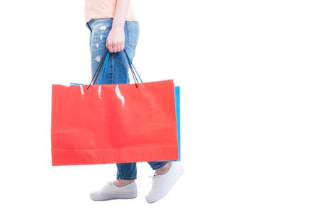 Cropped image of person in deep blue jeans walking with paper-bags after shopping in mall or boutique