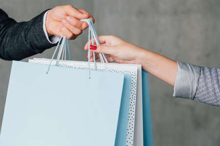 Close up shot of female and male hands holding black and red paper bags, reaching for each other isolated over gray background