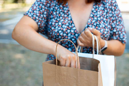 Woman holding shopping bags while doing shopping in the city. Closeup of woman holding brown and white shopping bags in the shopping mall.