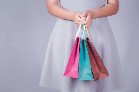 Female holding multicolored shopping bags gray background.