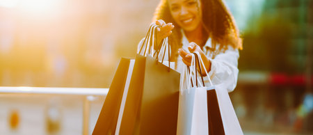 Excited happy African American curly woman enjoying shopping while standing on the street near shopping mall with shopping bags, Shopping, Black Friday
