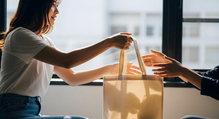 Two women are depicted exchanging a plain beige canvas tote bag near a bright window. The profile view captures the interaction of giving and receiving, symbolizing eco-friendly shopping, delivery, or a thoughtful gift. The scene promotes sustainable living and reusable products.