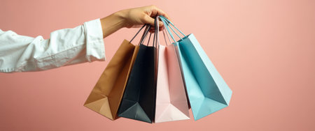 A stylish hand holds four vibrant shopping bags against a soft pink backdrop, radiating a sense of excitement and joy. Each bag, in shades of brown, black, pink, and blue, showcases a modern design, symbolizing a delightful shopping spree filled with treasures waiting to be unveiled.