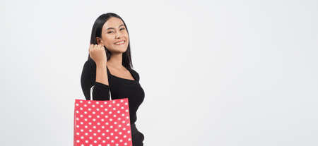 attractive beautiful asian woman red dress hand hold shopping bag big smile with happiness and joyful white background