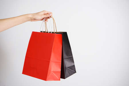 Woman hand holding black shopping paper bag with one hand isolated on white background.