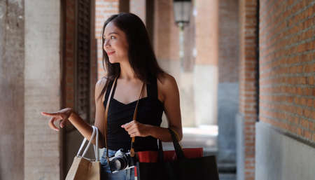 Portrait of young Asian woman holding and showing her shopping bags after shopping in retail store. Shot of Consumerism and Shopping concept.