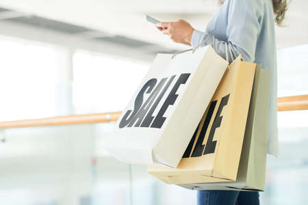 Hands of two young contemporary shoppers with smartphones and paperbags