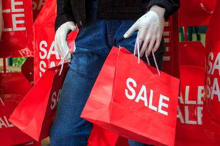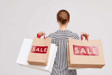 Rear view of young woman with hair bun leaving shop with hands full of shopping paper bags with sale inscriptions