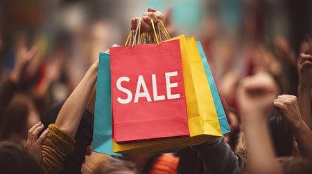 Colorful shopping bags marked with SALE signal an exciting event in a bustling urban setting, capturing the energy of enthusiastic shoppers.