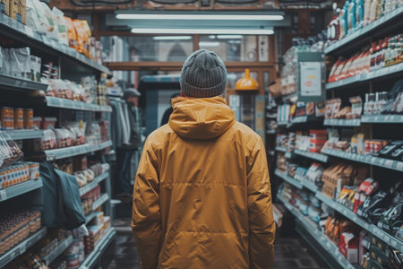 A young man wearing a backpack and jacket stands in a modern store, surrounded by shelves filled with various items. The image captures a moment of contemplation and urban lifestyle.