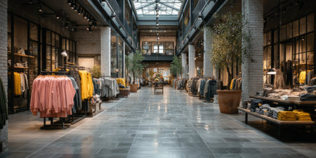 Modern clothing store interior with a stylish apparel displays, natural lighting, and spacious layout.