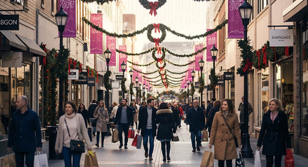 A bustling street lined with shops, adorned with festive Christmas garlands and lights, filled with people enjoying holiday shopping.