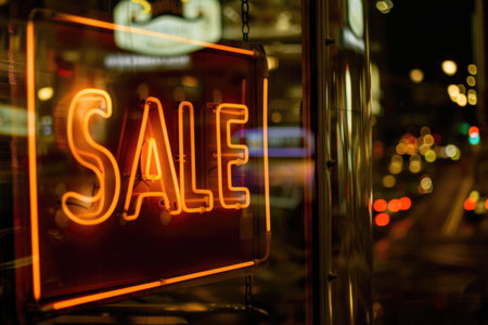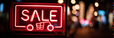 A vibrant neon sale sign shines brightly in the night, surrounded by a backdrop of blurred city lights creating a lively atmosphere.