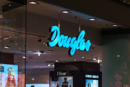 BERLIN - DECEMBER 18, 2017: Douglas logo in the Arkaden shopping mall at Potsdamer Platz. Douglas - German and the international chain of perfumes store.