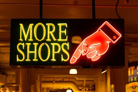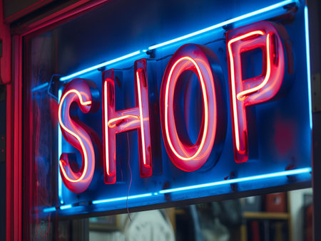 Vibrant neon sign with the word SHOP glowing in red and blue against a dark background.