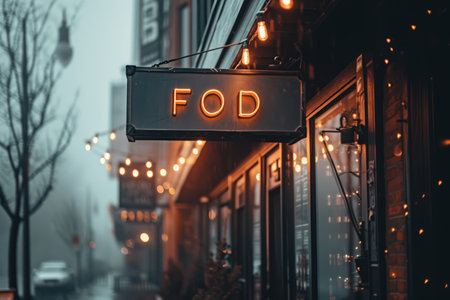 A person warmly dressed is closing a door while holding a sign in a vibrant urban setting. Soft lights reflect in the window, creating a cozy atmosphere.