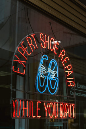 A bright neon sign displays expert shoe repair services available while customers wait inside the shop.