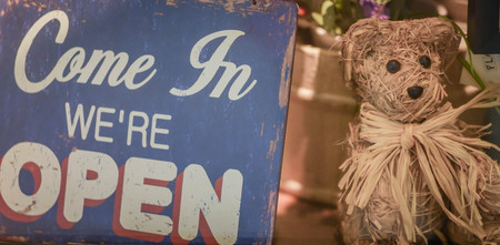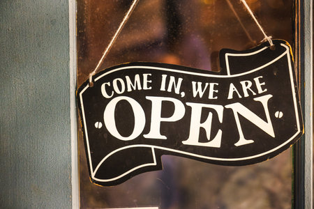A hanging sign announces in bold letters, 'Welcome, We are Open' conveying invitation