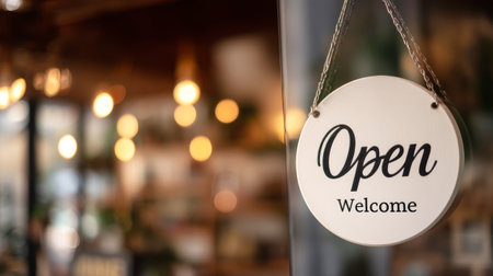 Close-up view of a white round signboard with the words Open and Welcome displayed prominently, hanging at the entrance of a cozy cafe, inviting customers inside.