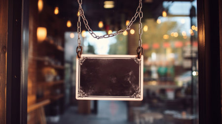 Blank blackboard hanging on a chain in a cafe, vintage style