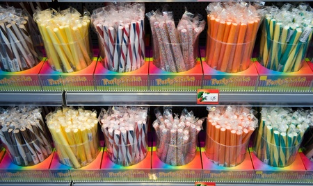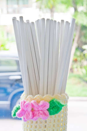 Multicolored tubes for a cocktail in a bundle on the bar with a place for text.
