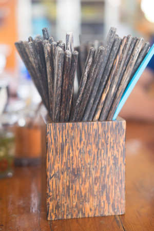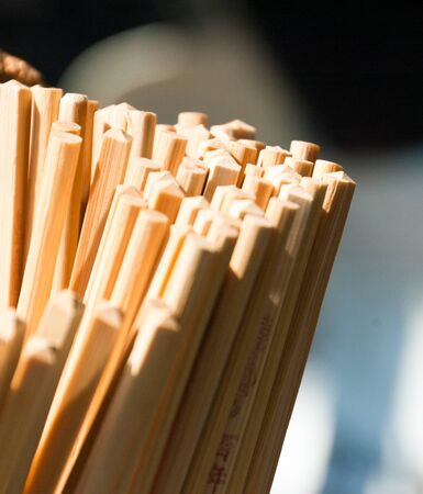 Many wood chopsticks in a box at restaurant. Selective Focus