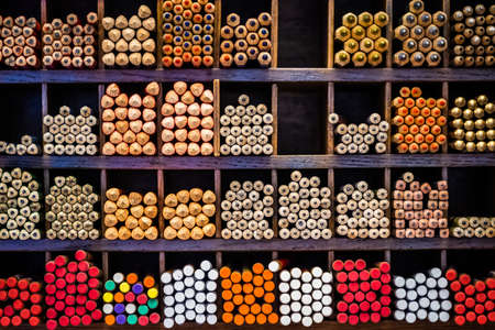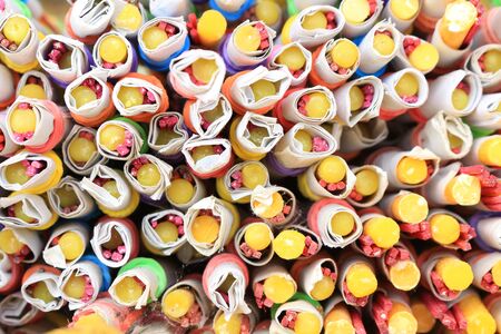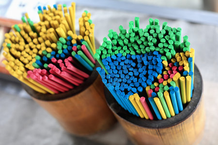 Multi-colored incense sticks placed in wooden cylindrical pannikins for sale to the devotees visiting the Hase-dera or Hasse-Kannon buddhist temple in Kamakura-Kanagawa prefecture-Japan.