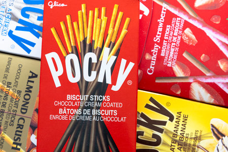 Calgary, Alberta, Canada. Jun 25, 2023. A close up to a box of Pocky, a Japanese sweet snack food produced by the Ezaki Glico food company.