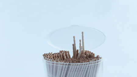 Lots of wooden toothpicks on a blue background. Abstract background for the design. The view from the top