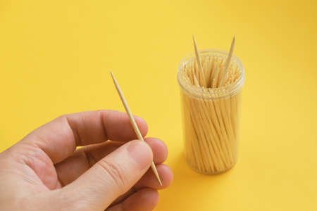 Man holds a wooden toothpick in his hands on a yellow background. Oral hygiene after eating.