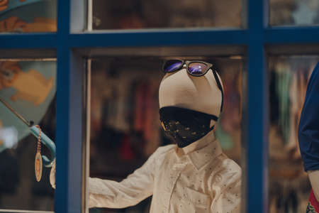 Stow-on-the-Wold, England - July 6, 2020: View through the window of mannequins on shop display wearing a face mask. Face masks will be compulsory in shops in England from 24th July. Selective focus.