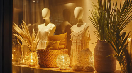 This artistic display features elegant mannequins adorned with stylish clothing, complemented by warm lighting and decorative elements, creating an inviting boutique atmosphere.